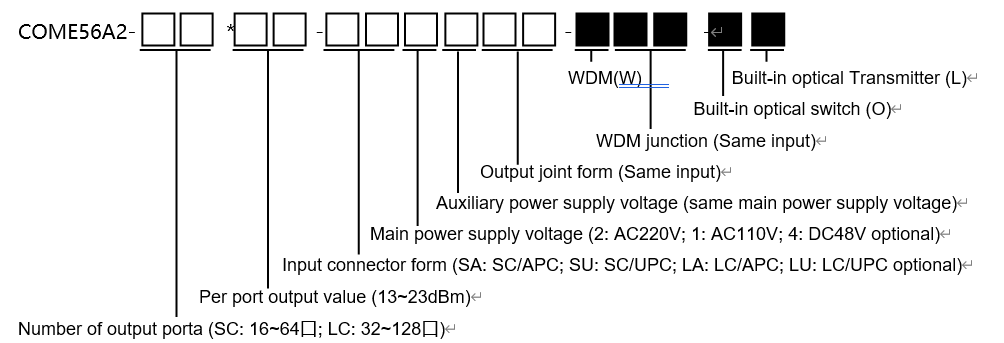 COME-56A2-Output port*Per port output power-Input optical connector+Main power supply voltage+Sub power supply voltage+Output connector-with WDM+WDM connector+OSW+Optical transmitter (Note: When the black box has no order requirement, do not write).