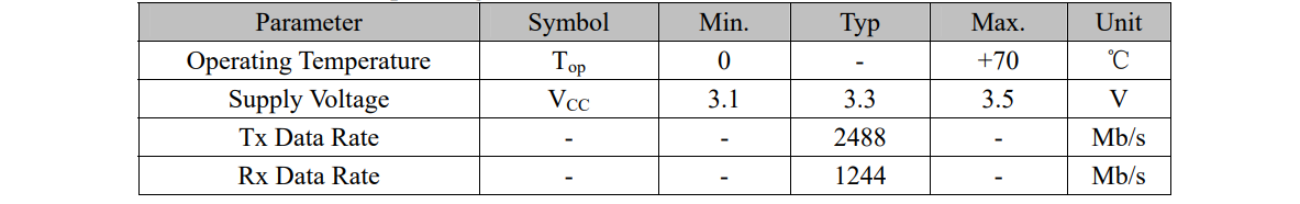 2. TX Disable is an input that is used to shut down the transmitter optical output. It is pulled upwithin the module with a 4.7K~10K resistor. Its states are:Low (0_0.8V): Transmitter on
