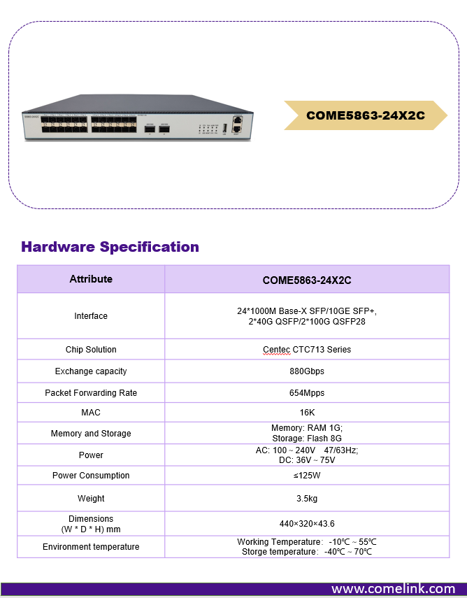 The COME5863-24X2C switch is a high-performance full 10G access, 40G and 100G uplink core routing Layer 3 switch product independently developed by the company. It can not only meet the high-density and high-bandwidth network application requirements of the next-generation enterprise network, data center and metropolitan area network, but also meet the application requirements of telecom network operators or campus Ethernet aggregation layer or access layer, and can also be used as a data center connection layer. The entry layer and the core layer of small and medium-sized enterprises provide rich server access solutions for the data center.